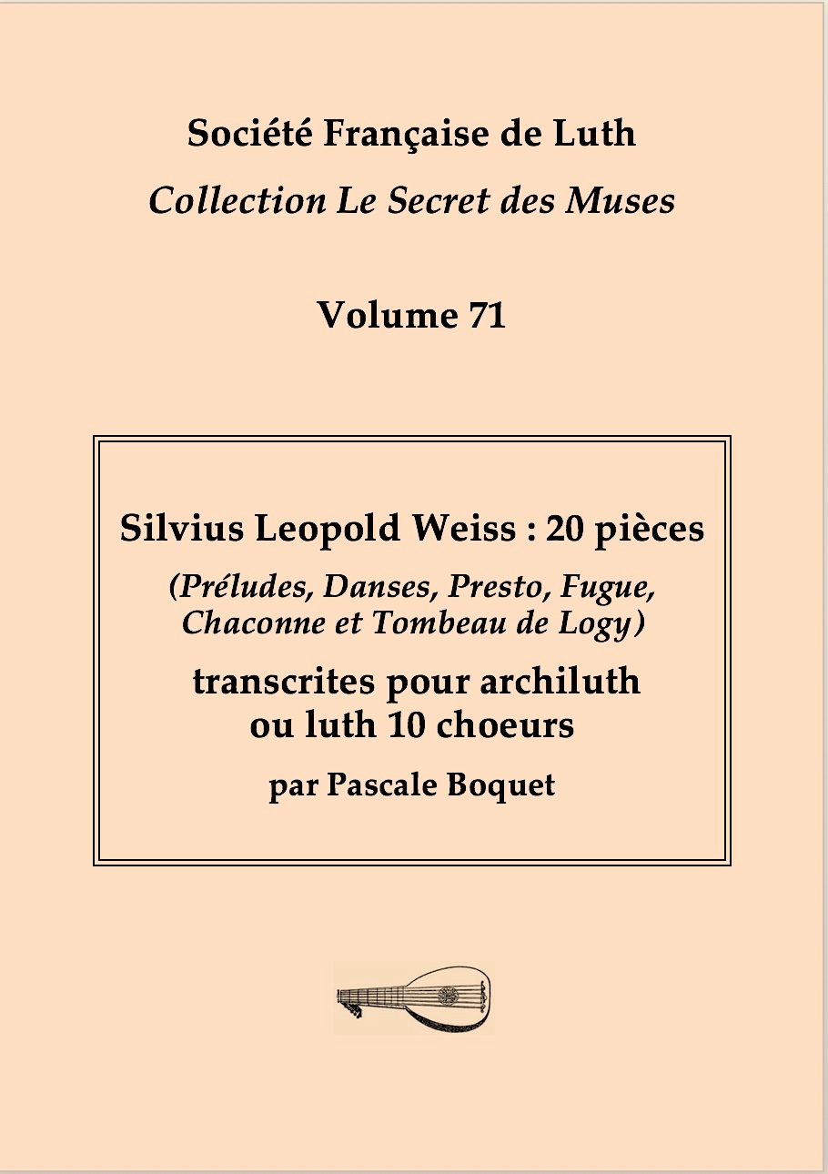 Volume 71 : S.L Weiss : 20 pièces transcrites pour archiluth ou luth 10 chœurs (Préludes, Danses, Presto, Fugue, Chaconne et Tombeau de Logy) by Pascale Boquet - 2025 - 30 pages Price : 10/13€ + FR.4€ - ET.5€