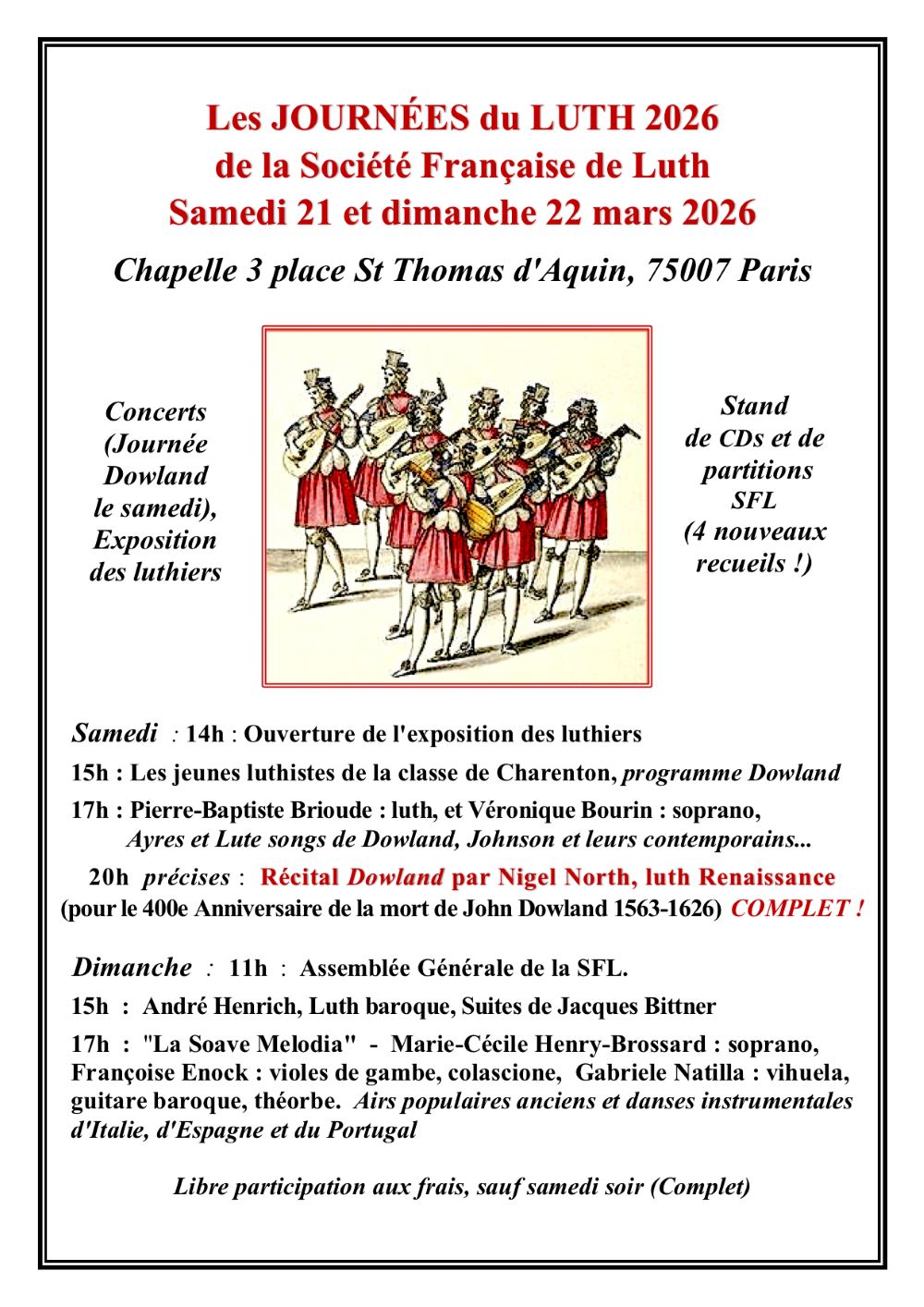 Bulletin numérique "Le Joueur de Luth" : envoi aux adhérents début février ! Pour le recevoir, n'oubliez pas de régler votre adhésion 2026 ! En ligne sur ce site, ou par mail et virement : toujours 30€, pour 3 bulletins numériques (60 à 90 pages) par an, bénéficier du tarif adhérent des Éditions SFL (+ de 70 titres !), et enfin pour soutenir une association bien active mais qui ne reçoit aucune subvention ! À bientôt !